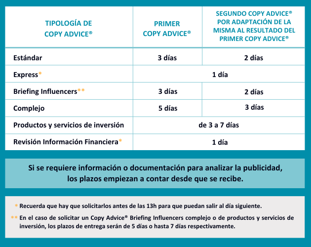 Dependiendo del tipo de Copy Advice® solicitado los plazos pueden variar. Consulta plazos establecidos en la siguiente tabla: